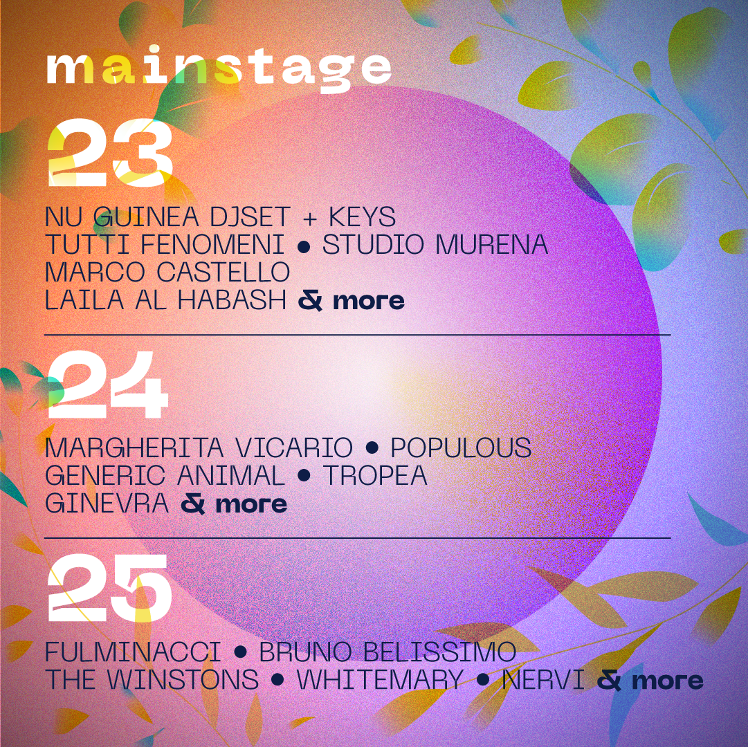 Sabato 24 Luglio fa Bingo con MARGHERITA VICARIO, un viaggio in technicolor di una delle artiste più poliedriche della scena musicale attuale. Con GENERIC ANIMAL, pseudonimo e progetto solista di Luca Galizia che nel 2020 ha fatto uscire il terzo disco Presto e che ha recentemente annunciato nuove cose in arrivo. Di sogni, sottoculture digitali, cringe life parlano invece i TROPEA mentre dall’alternative rock inglese e dall’elettronica attinge la giovane cantautrice GINEVRA. Chiude la giornata il produttore pugliese POPULOUS in un set dalle atmosfere ambient e instrumental hip-hop tratto da Stasi, l’ultimo album scritto e prodotto in un Salento immobile e silenzioso, immerso in un’atmosfera sospesa.
