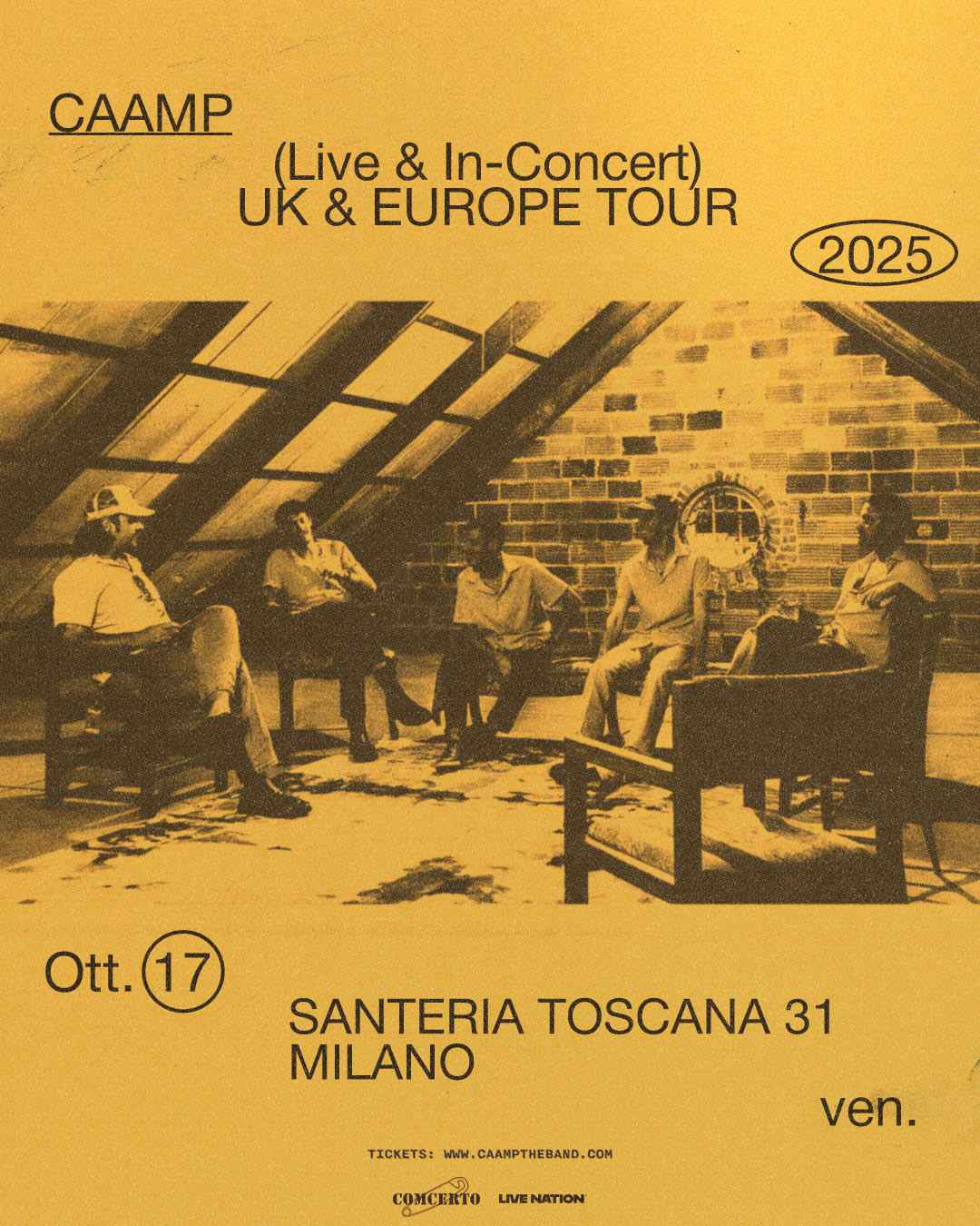 Dal debutto nel 2016 con l’album omonimo – che ha collezionato centinaia di milioni di stream e ottenuto il primo disco d’oro – ai successi di By and By (2019) e Lavender Days (2022), che li ha portati a suonare nei più prestigiosi festival e venue del mondo, i Caamp hanno saputo costruire un percorso coerente, sincero e in continua evoluzione. Con oltre 2,5 miliardi di stream globali, quattro singoli al numero uno nelle radio alternative americane e una fanbase in costante crescita, oggi rappresentano una delle realtà più potenti e poetiche del panorama musicale indipendente.