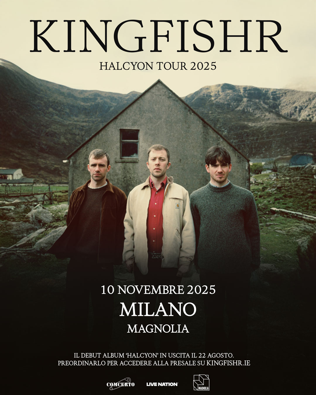 Halcyon racconta il percorso artistico dei Kingfishr, con un mix di brani già noti come Flowers-FireEyes Don’t LieKilleaghGloria e Man On The Moon, oltre a numerosi inediti come 21Next To MeSomeday e Schooldays. L’album rappresenta una sintesi perfetta tra l’energia dell’indie-rock contemporaneo e le profonde radici musicali irlandesi della band, cresciuta in diverse zone rurali d’Irlanda e nata in una fattoria lattiero-casearia di Tipperary.