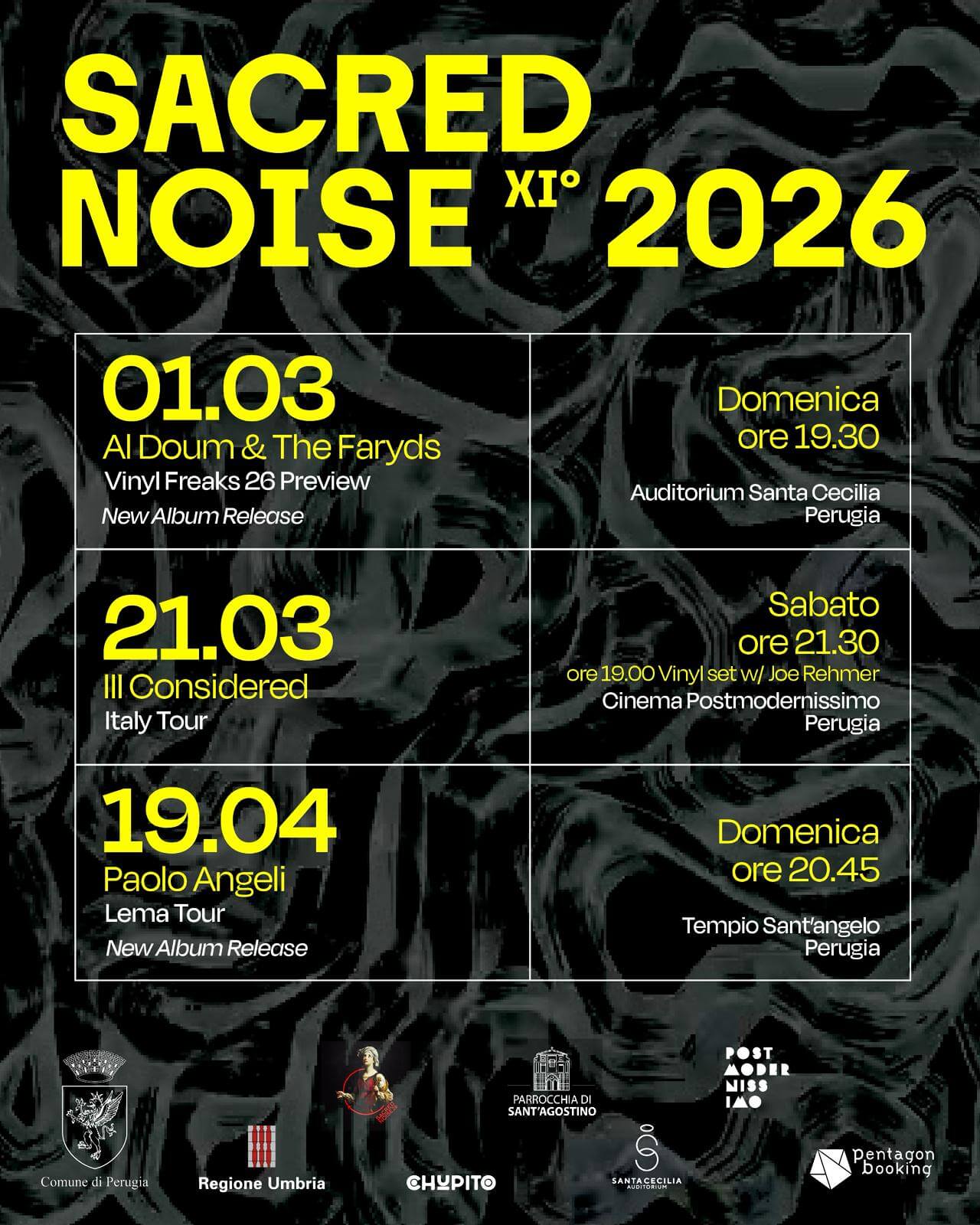 La stagione 2026 riparte infatti con molte novità, confermando l’attenzione per la ricerca e i contenuti non convenzionali: un nuovo ciclo di proposte che è iniziata domenica 1 marzo con la presentazione del nuovo album di Al Doum & The Faryds presso l’Auditorium Santa Cecilia, storica venue dove è nata la rassegna; è preseguita poi sabato 21 marzo presso il cinema Postmodernissimo con il concerto degli Ill Considered, ensemble del Regno Unito noto per il suo approccio spontaneo e altamente improvvisato.