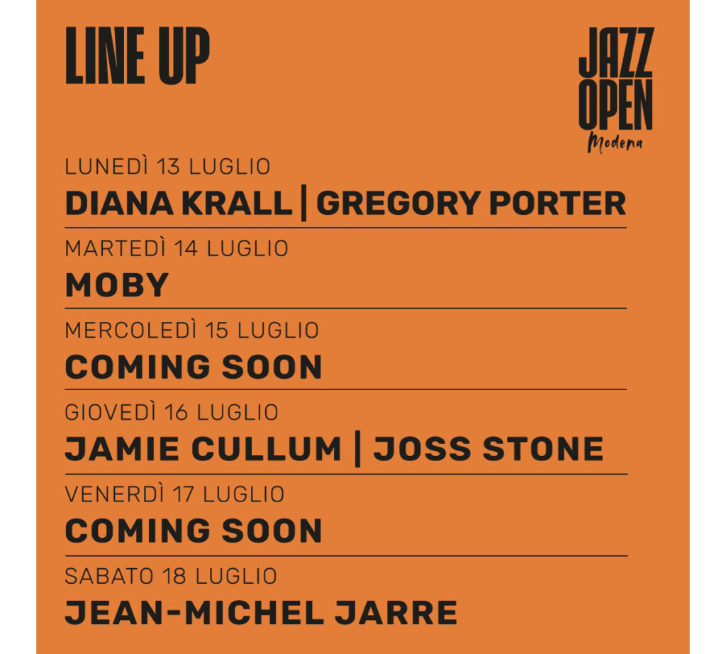 Il live di Moby è solo uno degli straordinari appuntamenti di Jazz Open Modena che dal 13 al 18 luglio, trasformerà la città emiliana in un palco a cielo aperto con le esibizioni di Diana Krall e Gregory Porter (13 luglio) Parov Stelar, e Meute (15 luglio), Jamie Cullum, e Joss Stone (16 luglio), Luca Carboni (17 luglio), Jean-Michel Jarre (18 luglio). Alla sua prima edizione italiana, il festival – curato e ideato da Jurgen Schlensog – porta anche a Modena il tradizionale format di successo Jazz & Beyond, che mette in dialogo il jazz con altri linguaggi musicali, dal pop al soul, al rock fino all’elettronica.